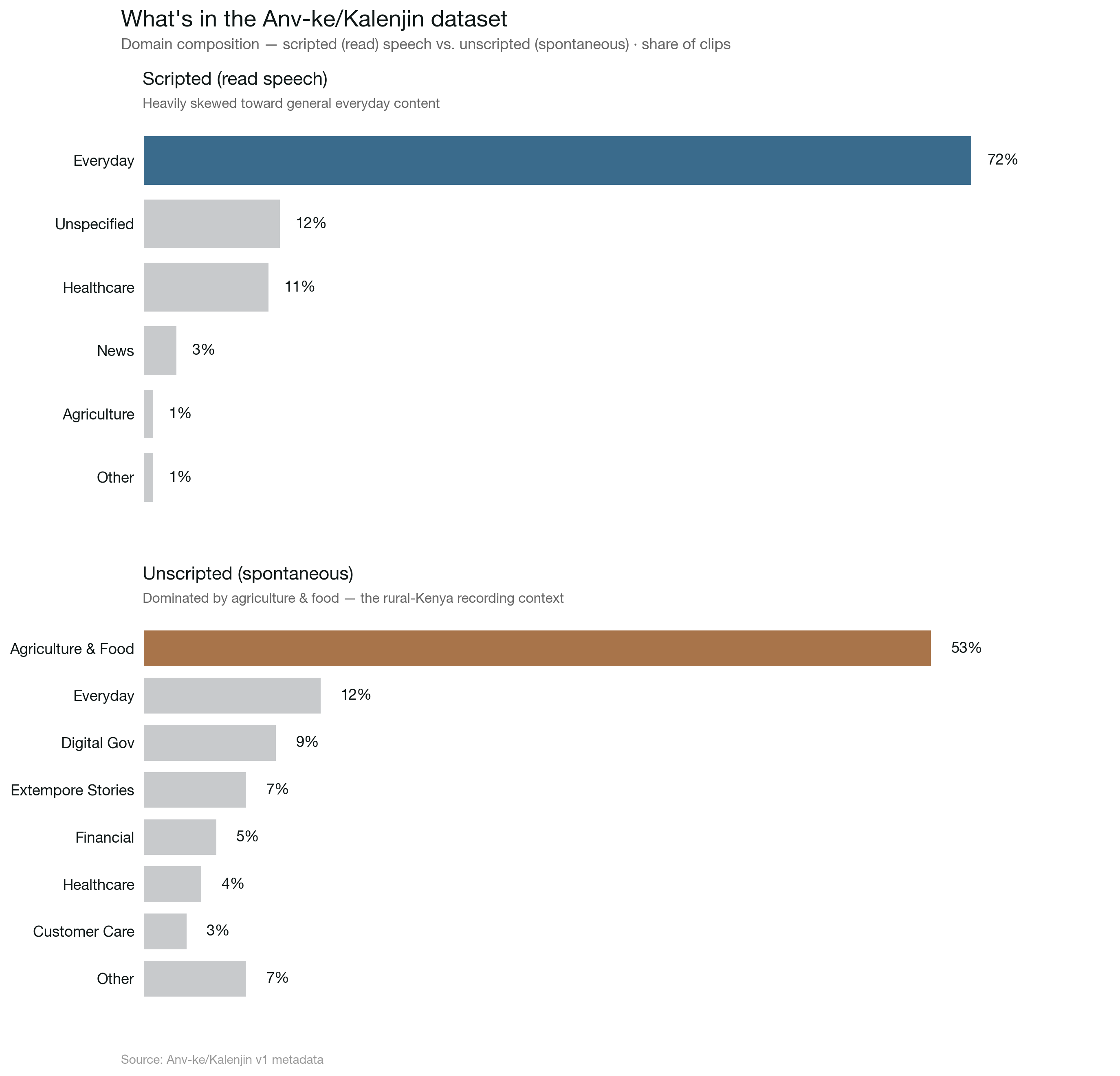 Scripted (read speech): Everyday Scenarios 72%, Unspecified 12%, Healthcare 11%, News 3%, Agriculture 1%, rest under 1%. Unscripted (spontaneous): Agriculture and Food 53%, Everyday 12%, Digital Government 9%, Extempore Stories 7%, Financial 5%, Healthcare 4%, Customer Care 3%, the rest under 2% each.