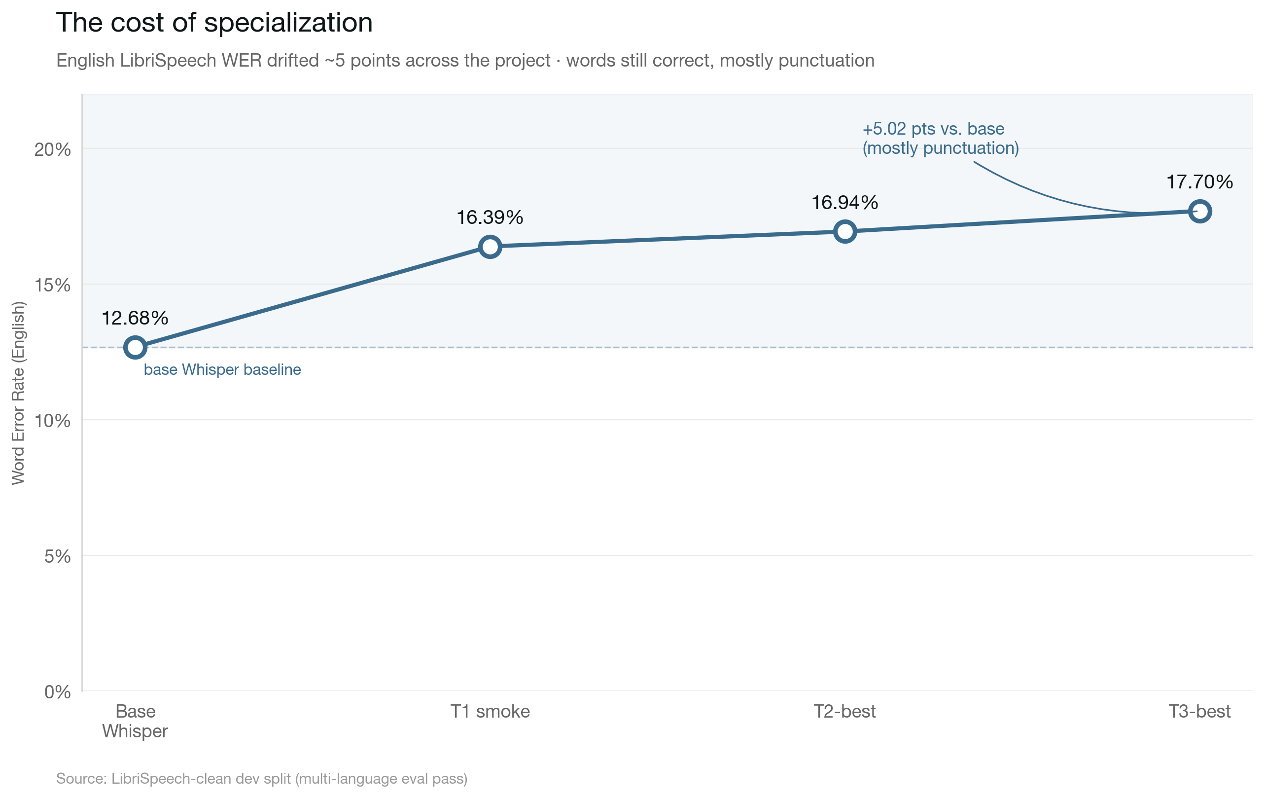 - English regression: the model is roughly 5 WER points worse than base Whisper on English (mostly punctuation drift, not word errors). If you need bilingual ASR, run base Whisper for English audio.