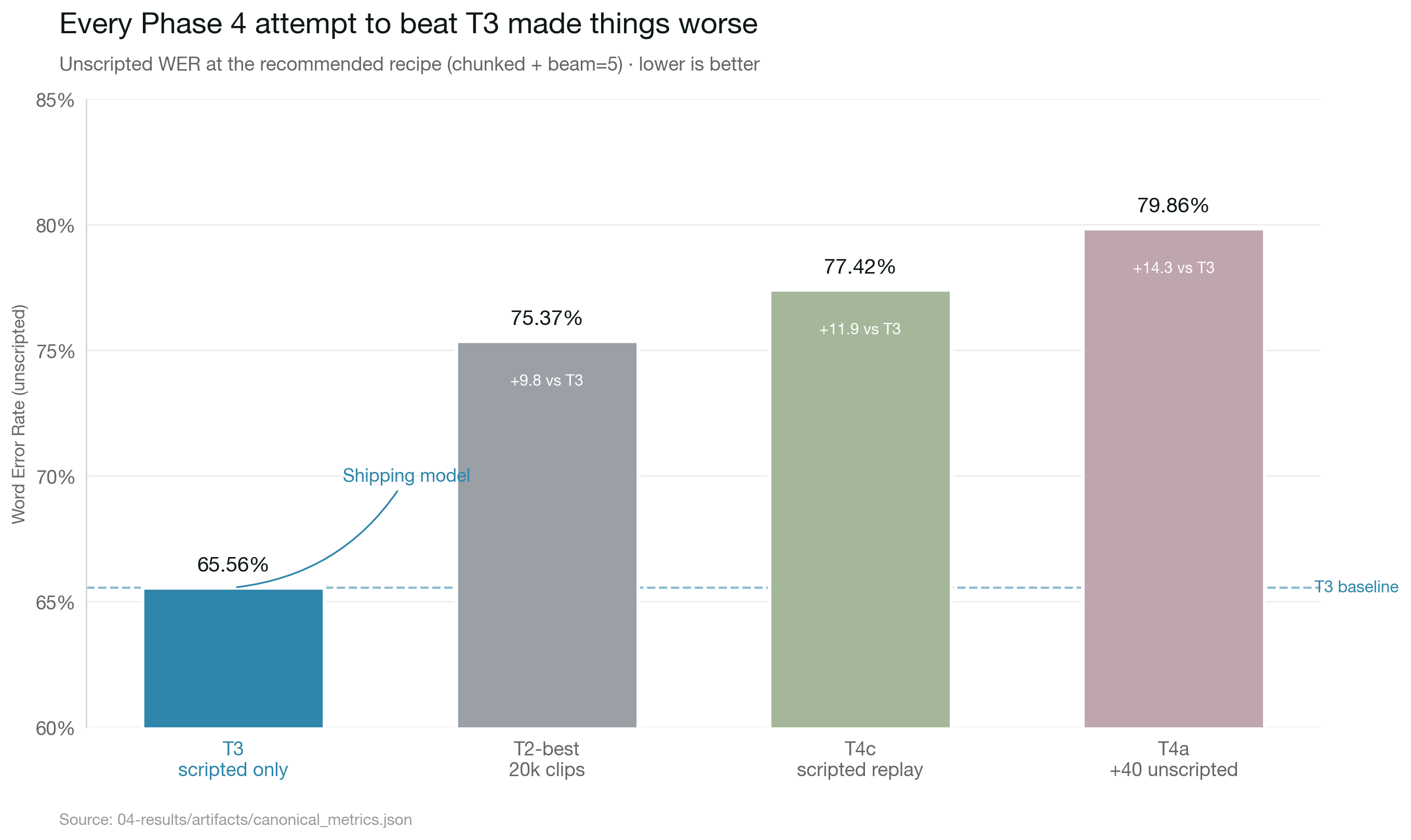 Total Phase 4 spend: roughly $20 across T4a, T4b, T4c-crashed, T4c-retry, all the follow-up chunked evals, and the dialect-stratification audits. Decision-quality data for the cost of a coffee shop dinner.