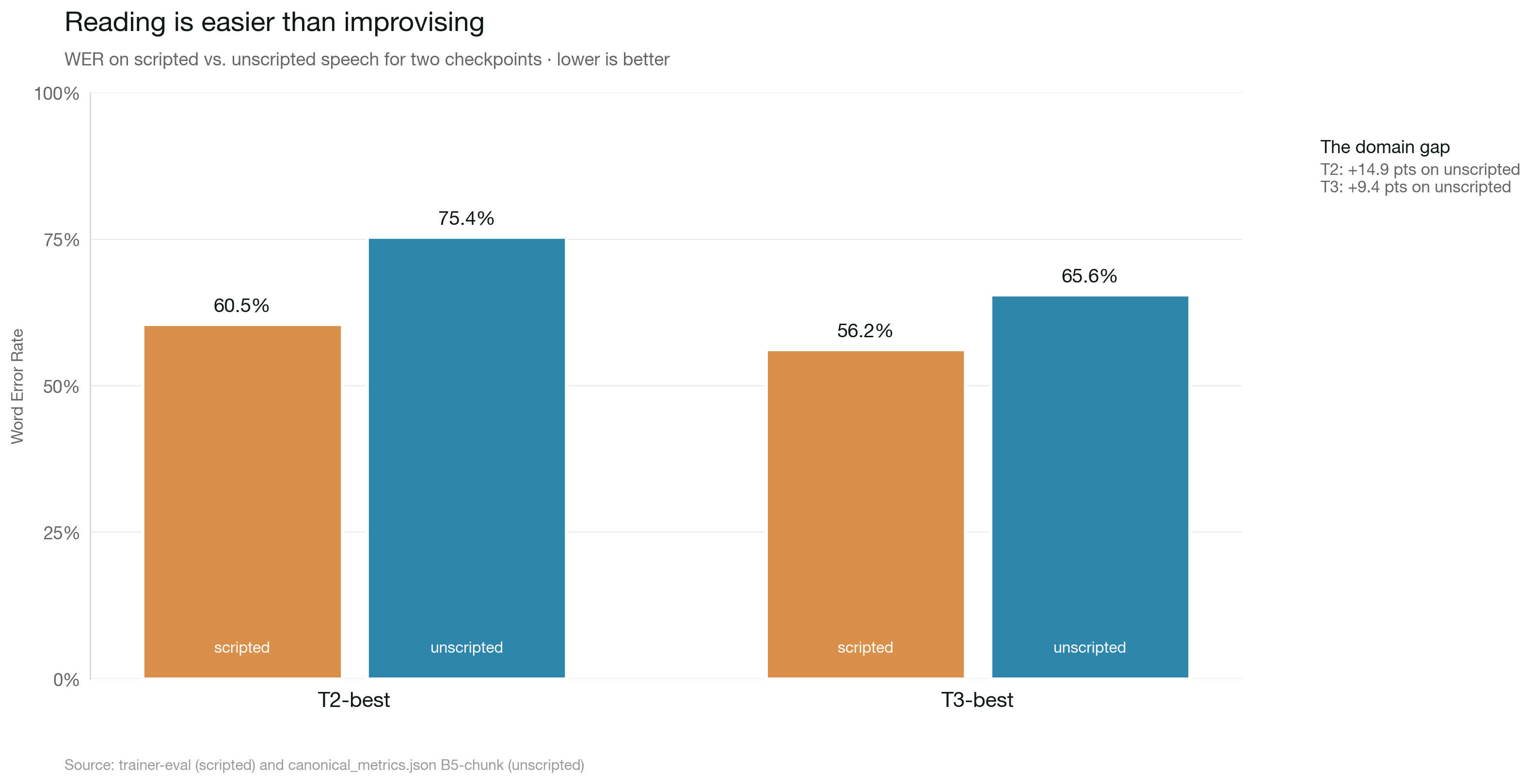 Probe runs earn their keep by being allowed to fail, and they earn their keep again by being allowed to tie. A $15 probe told me scripted replay is the right direction and 40 shards isn't enough data. A $50 full run would have told me the same thing louder. That's a win, even if the WER number isn't.