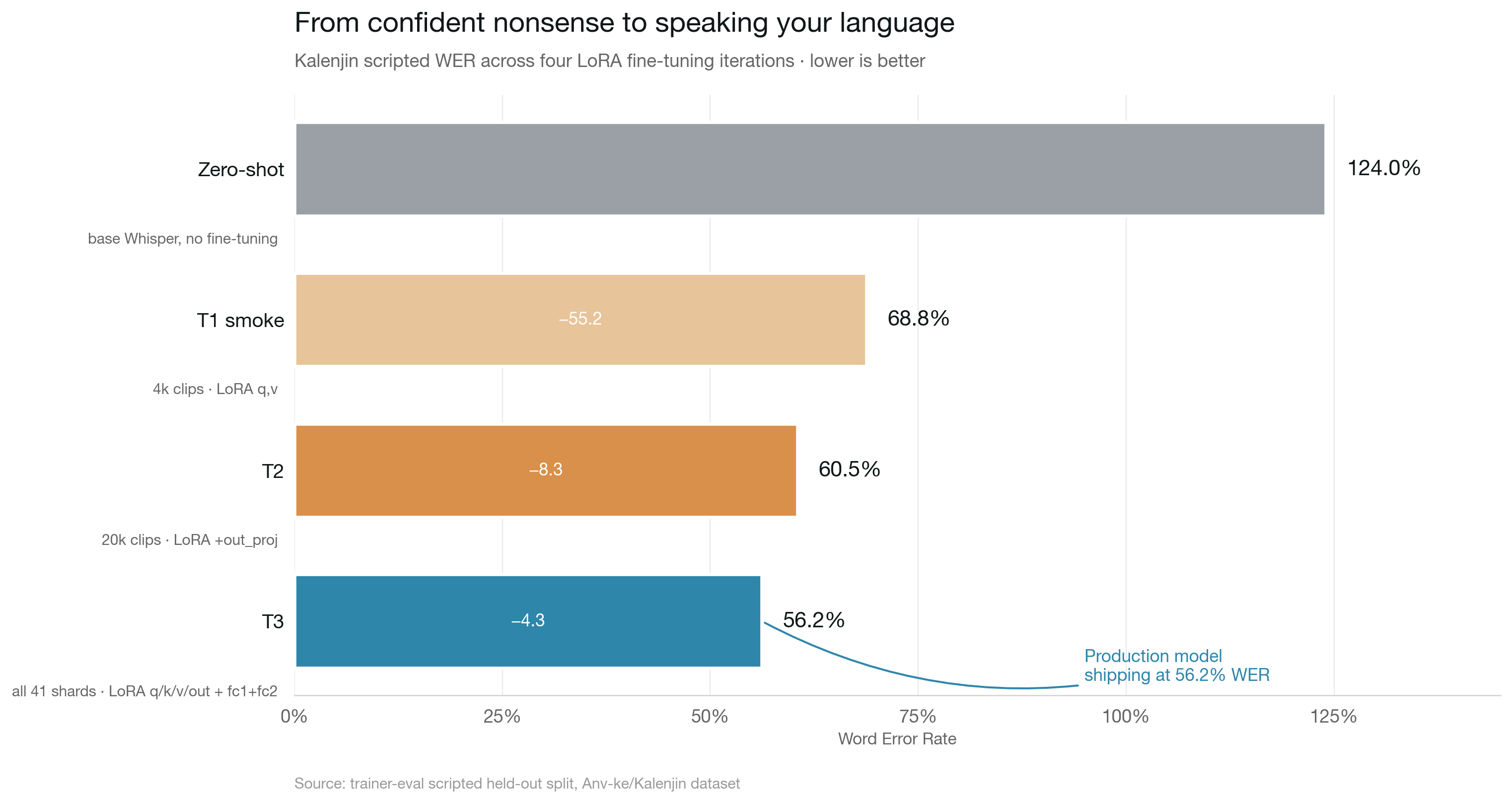 73% WER is still not deployable. Roughly three of every four words are wrong. But the failure mode changed entirely. Pre-training, Whisper was emitting Icelandic-looking mush and infinite njiawe ndo loops. After one epoch of LoRA, it's producing actual Kalenjin-shaped sequences that just aren't quite right yet. The difference between guessing randomly and speaking your language poorly is the entire battle.